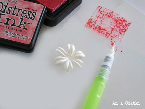 1. Tusz odbić na folii (koszulce foliowej). Wodnym pędzlem rozcięczyć trochę kolor i malować nim papierowy kwiatek. Do tego nadają się zwykłe tusze. Tusze specjalne i permamentne nie rozprowadzają się z wodą i ten manerw się nie powiedzie. Można też użyć akwareli.